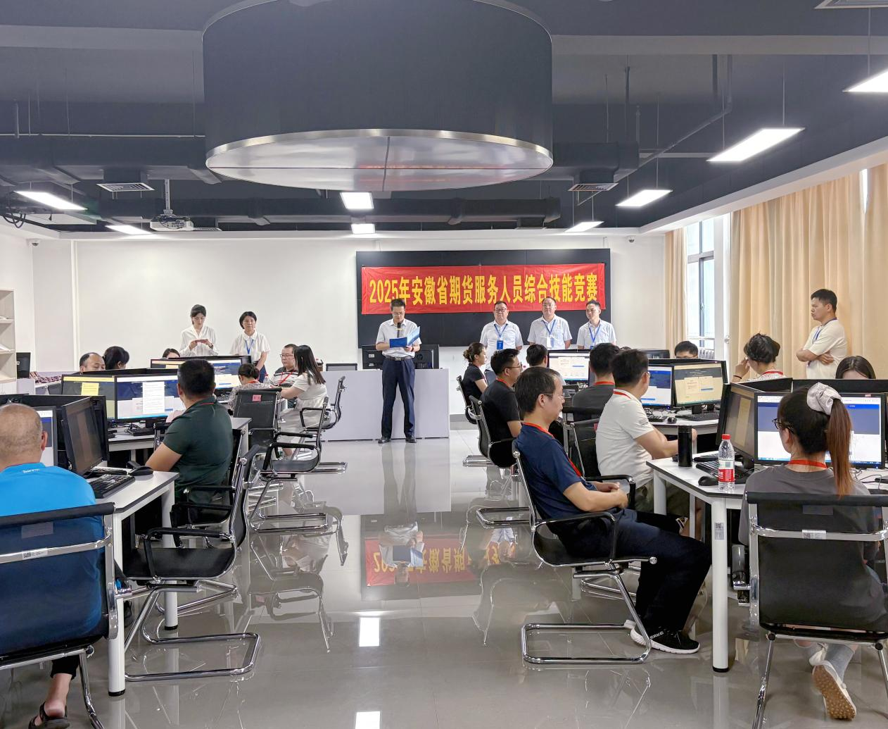 本次竞赛赛制设计科学严谨,层次分明,分为初赛、复赛和决赛三个阶段,全面覆盖理论知识与实践应用。初赛采用上机答题形式,重点考察选手对期货基础理论的掌握程度。比赛现场,选手们全神贯注,神情专注,唯有键盘敲击声与纸笔摩擦声细微可闻,整体氛围严谨有序,充分展现了安徽期货服务人员严谨务实、积极向上的精神风貌。