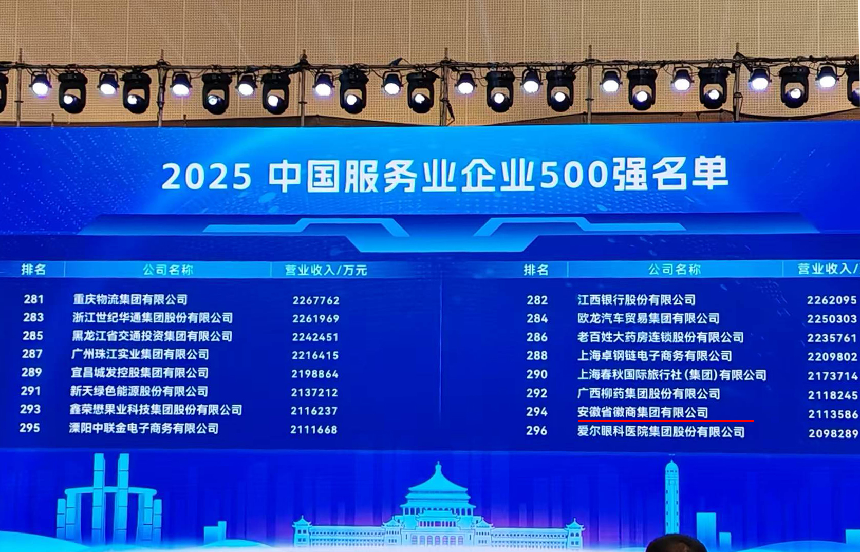 9月18日,在重庆举办的“2025现代服务业高质量发展大会”上,中国企业联合会、中国企业家协会发布了2025“中国服务业企业500强”榜单,徽商集团位列“中国服务业企业500强”第294位。